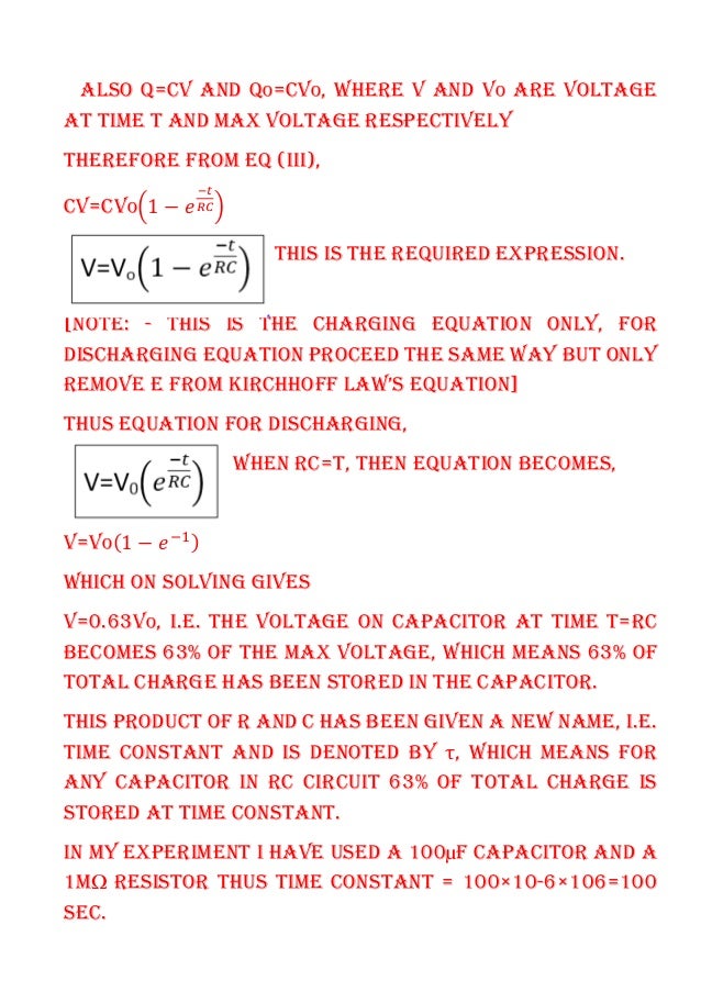 Conduct the experiment and record all the results in the observation. Aim- To verify that 63 charge is stored in a capacitor in a R-C circuit at its time constant and 63 charge remains when capacitor is discharged and hence plot a graph between voltage and time 2. How do you make a physics investigatory project.